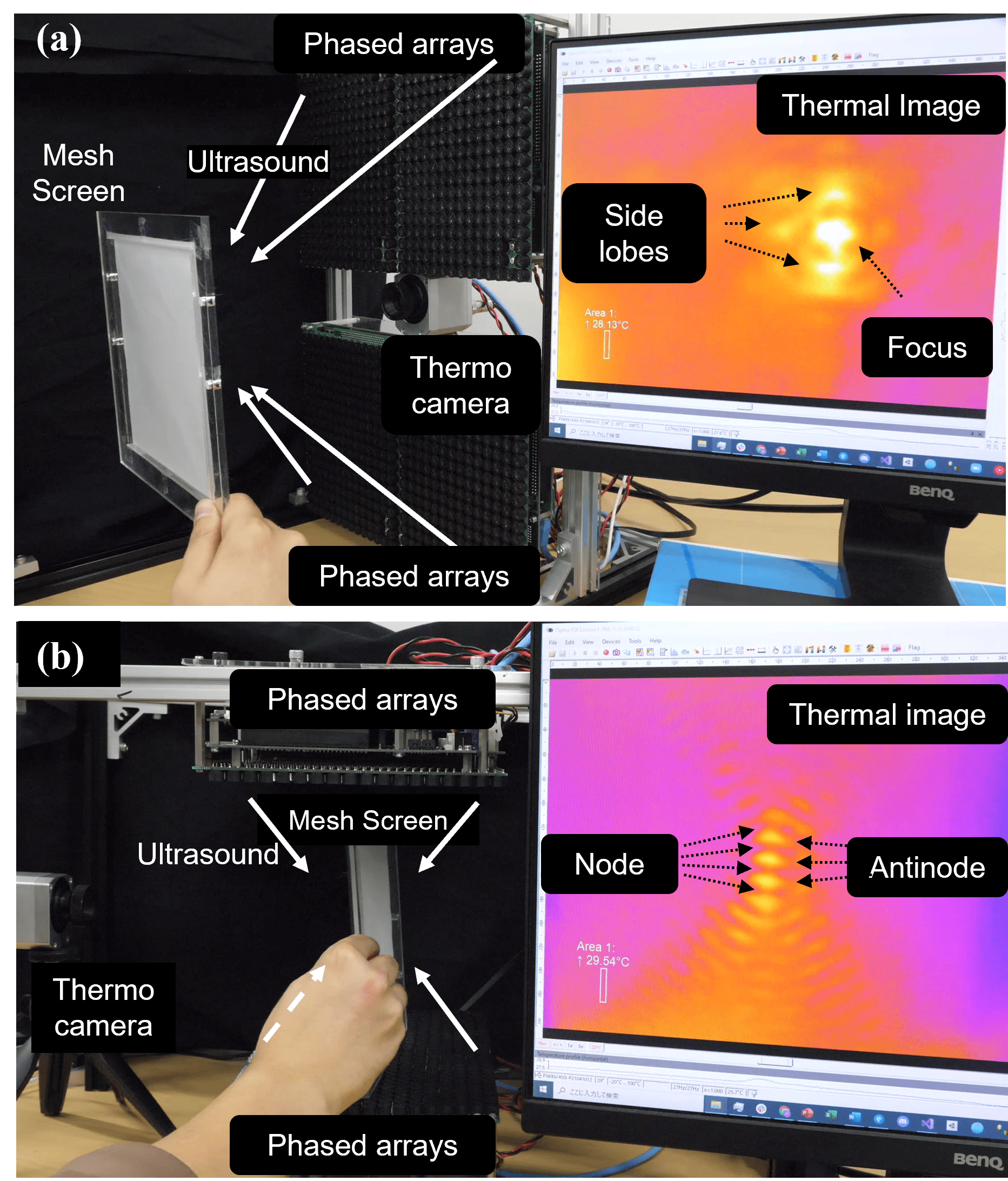 - Using thermal images of the mesh screen surface, a two-dimensional ultrasonic field can be visualized in real time.