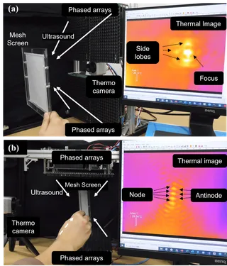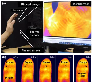 - Furthermore, we confirmed that even objects that completely reflect ultrasonic waves, such as a hand or an acrylic plate, can visualize the focal point and interference patterns from surface temperature information.