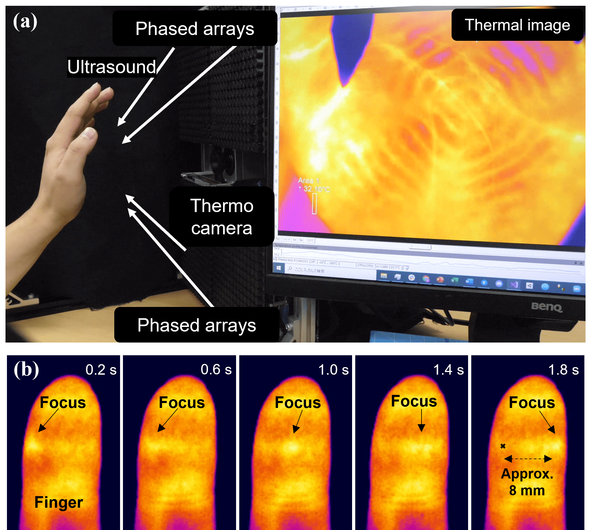 Fig.2 (a) The temperature distribution on the palm surface revealed a concentric pattern corresponding to the sound field. (b) An image sequence showing the temperature distribution at the fingertip revealed that the focal point moved in 2 mm steps every 0.4 seconds.