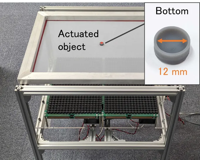 空中超音波を透過するメッシュスクリーンの上で,物体を操作する手法を開発しました.メッシュは超音波を透過するため,手や機械式のマニピュレータを使わず,非接触に物体を動かせます.