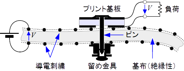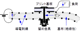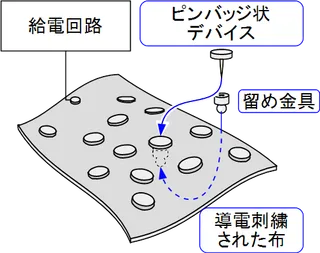 市販の腕時計型のウェアラブルデバイス等では内部に電池を内蔵しています.しかし,非常に小さいデバイスを数多く身体表面に分布させたシステムを構成するには,新しい電力供給と通信の方法が必要です.例えば全身にアクチュエータを分散配置したウェアラブル触覚提示スーツをTシャツや肌着のように薄く軽く実現することは,各アクチュエータへの個別の配線を多数引き回す方法では困難です. このための一つの方法として私たちが提案しているのは,衣服を給電と通信の媒体として利用し,デバイスは衣服にピンバッジのように取り付けるという方法です.この衣服には特別な刺繍を施した布地を使用します.