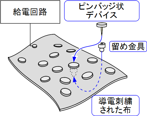 1枚の基布の両面に導電性の糸(導電糸)を刺繍したものを通信・給電の媒体として用います.導電糸は別の絶縁性の糸によって基布表面に固定されており,表裏の導電糸が導通することはありません.これにより,1枚の布の両面に独立した2本の電流パスが形成されます.ピンバッジ状に形成されたデバイス(LED,アクチュエータ,センサ等)をこの布状媒体に突き刺すことで給電を可能にします.布地に突刺すことで布地の表と裏それぞれでピンバッジ状コネクタと接触導通させ,ここに接続された電気回路に給電します.